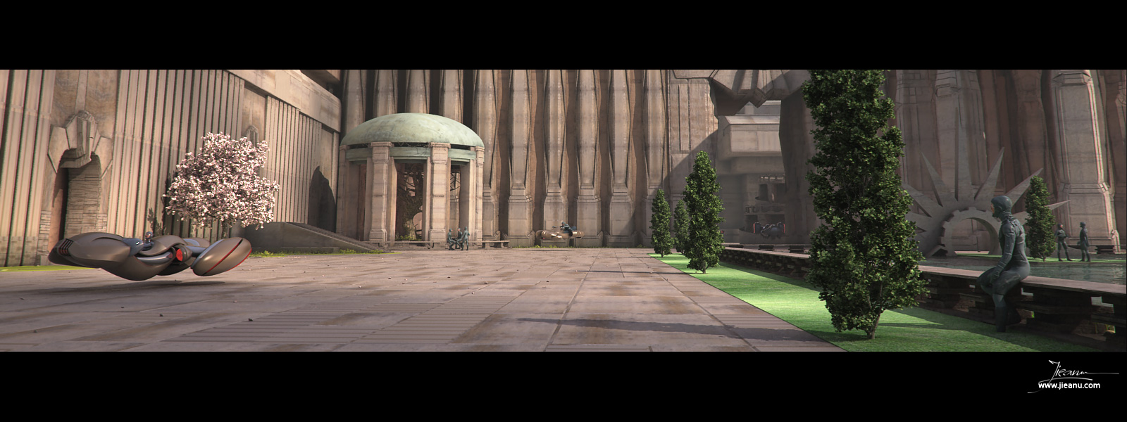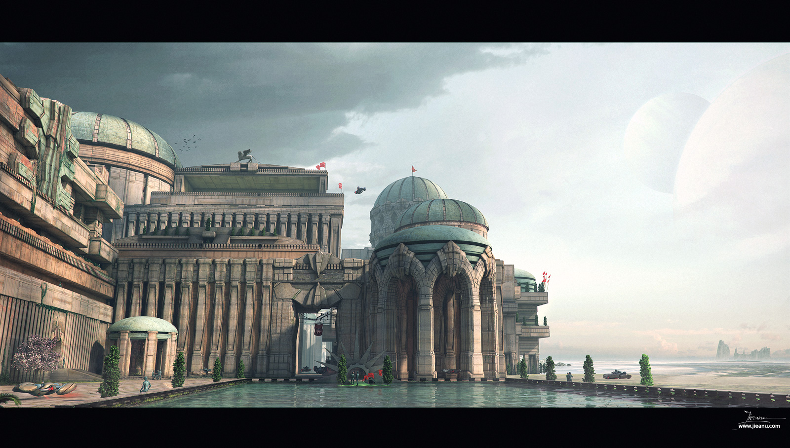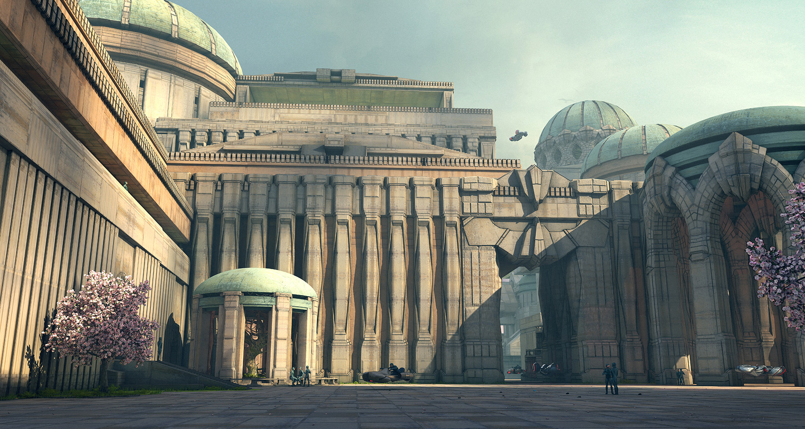 This one, started from a ruff sketch I did some time ago.Initially I just wanted to keep it on a concept stage but I got carried away and I started detailing for the next 3 weeks.The final resolution is 10.000 pixels wide.The subject is about a future generation of explorers who landed on an Earth like planet and they found this massive city, very similar to our ancient civilizations. Max and Vray for this one, and of course painted over in Photoshop.Check the Making off for further details.